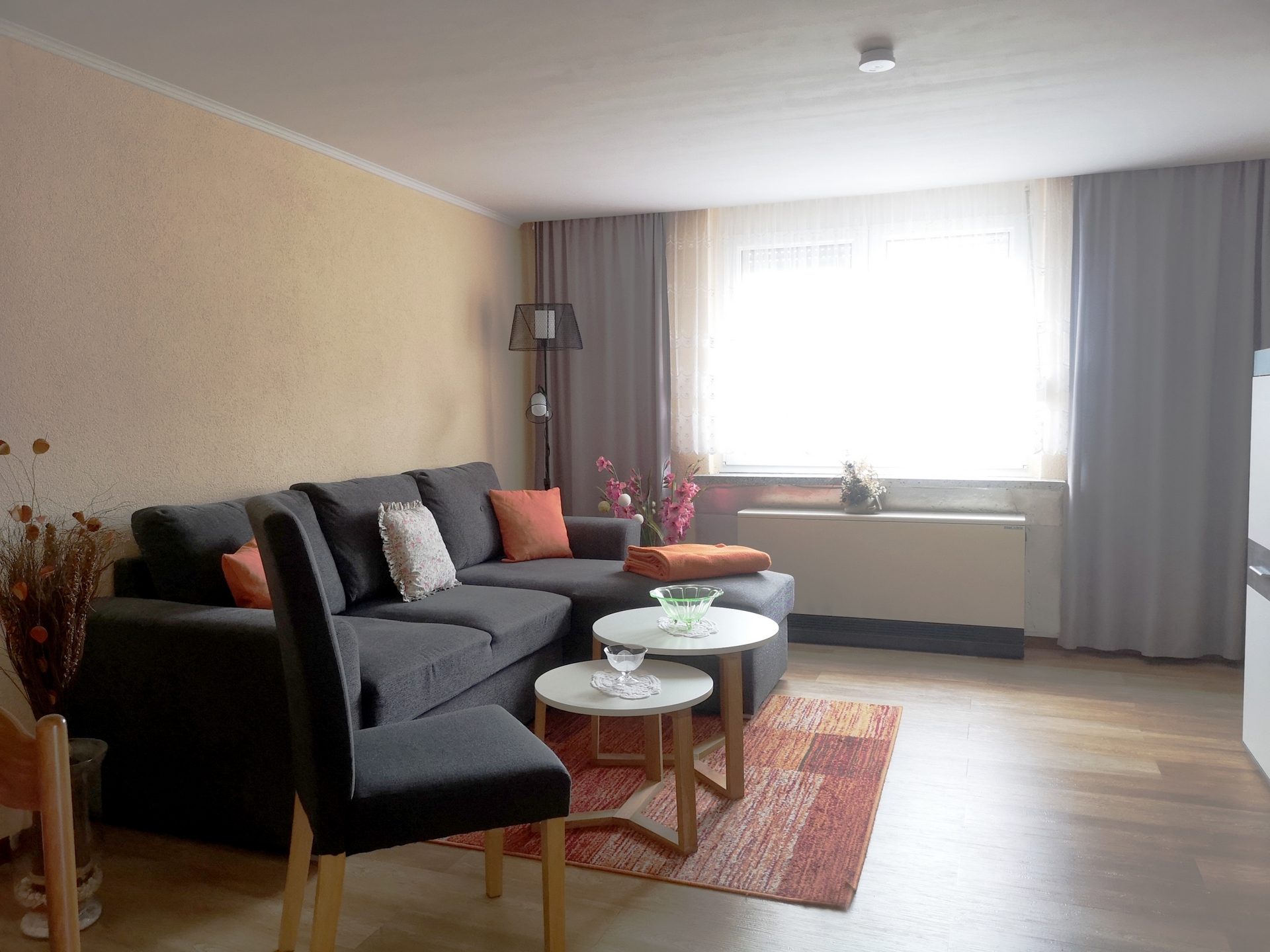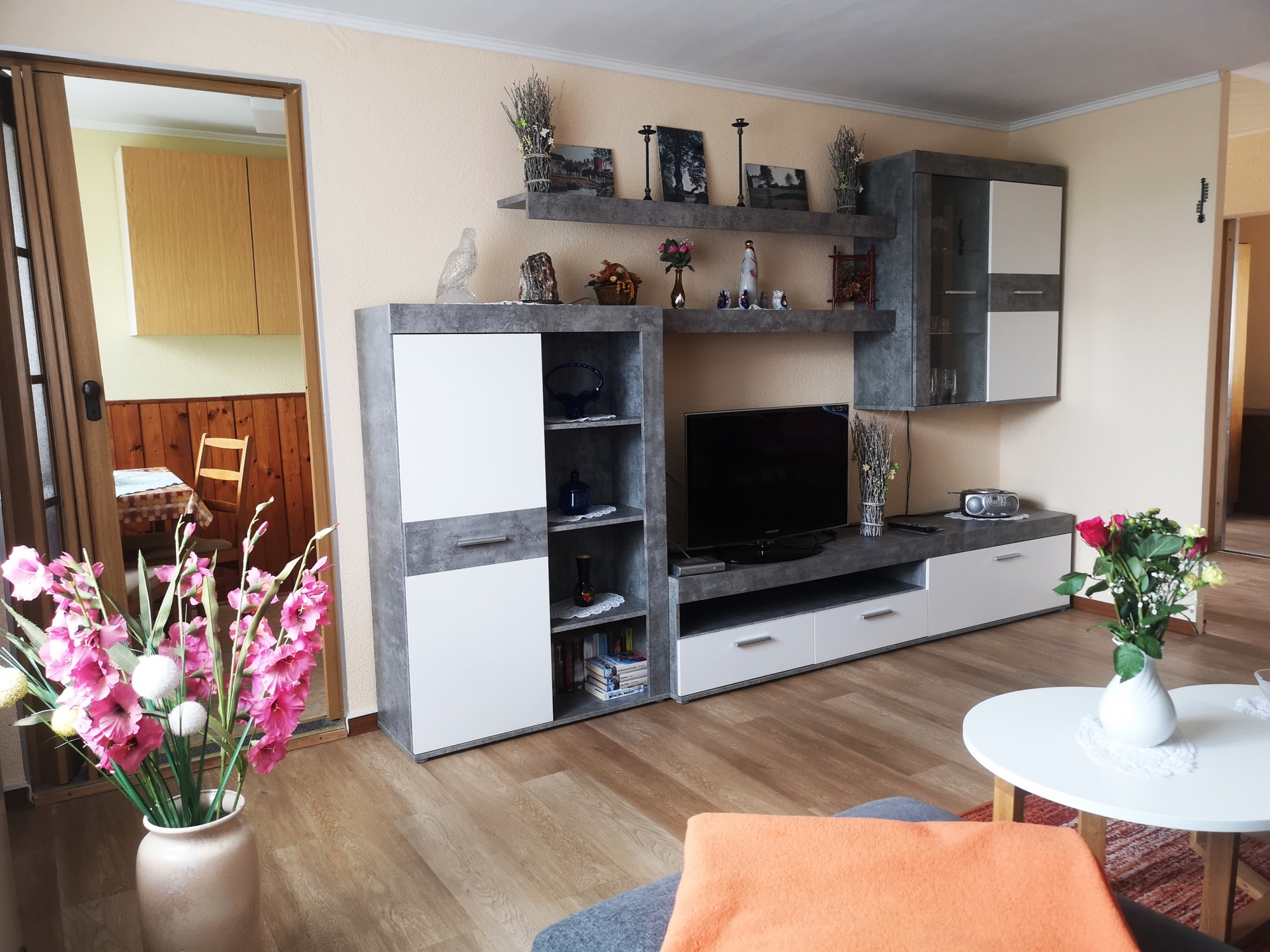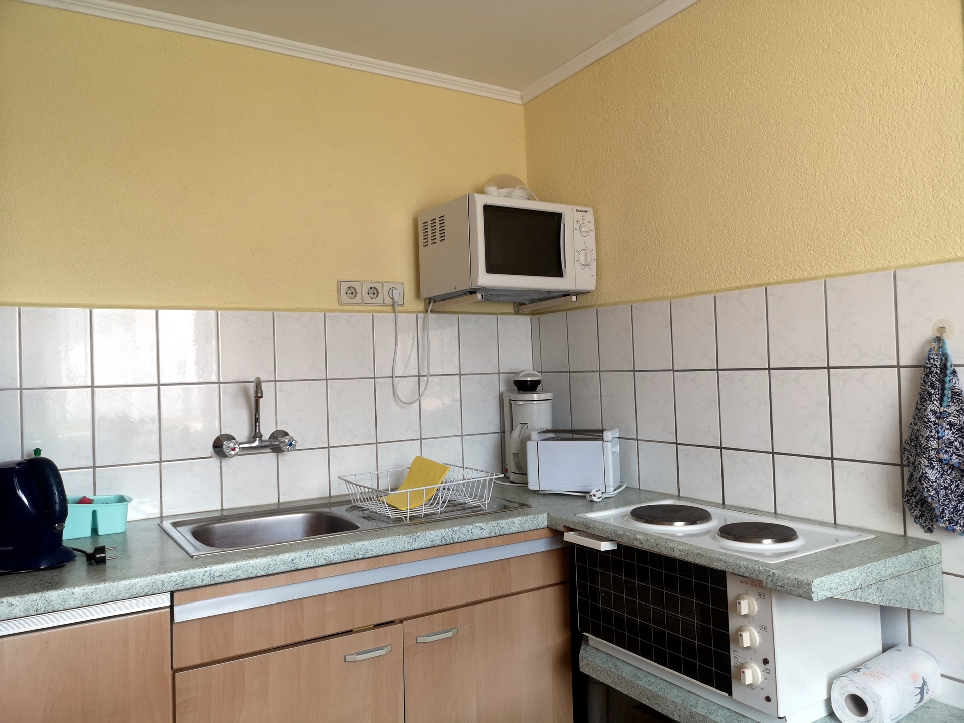 Kühschrank, elektrischer Herd, Mikrowelle, Kaffeemaschine, Geschirr u.v.m.